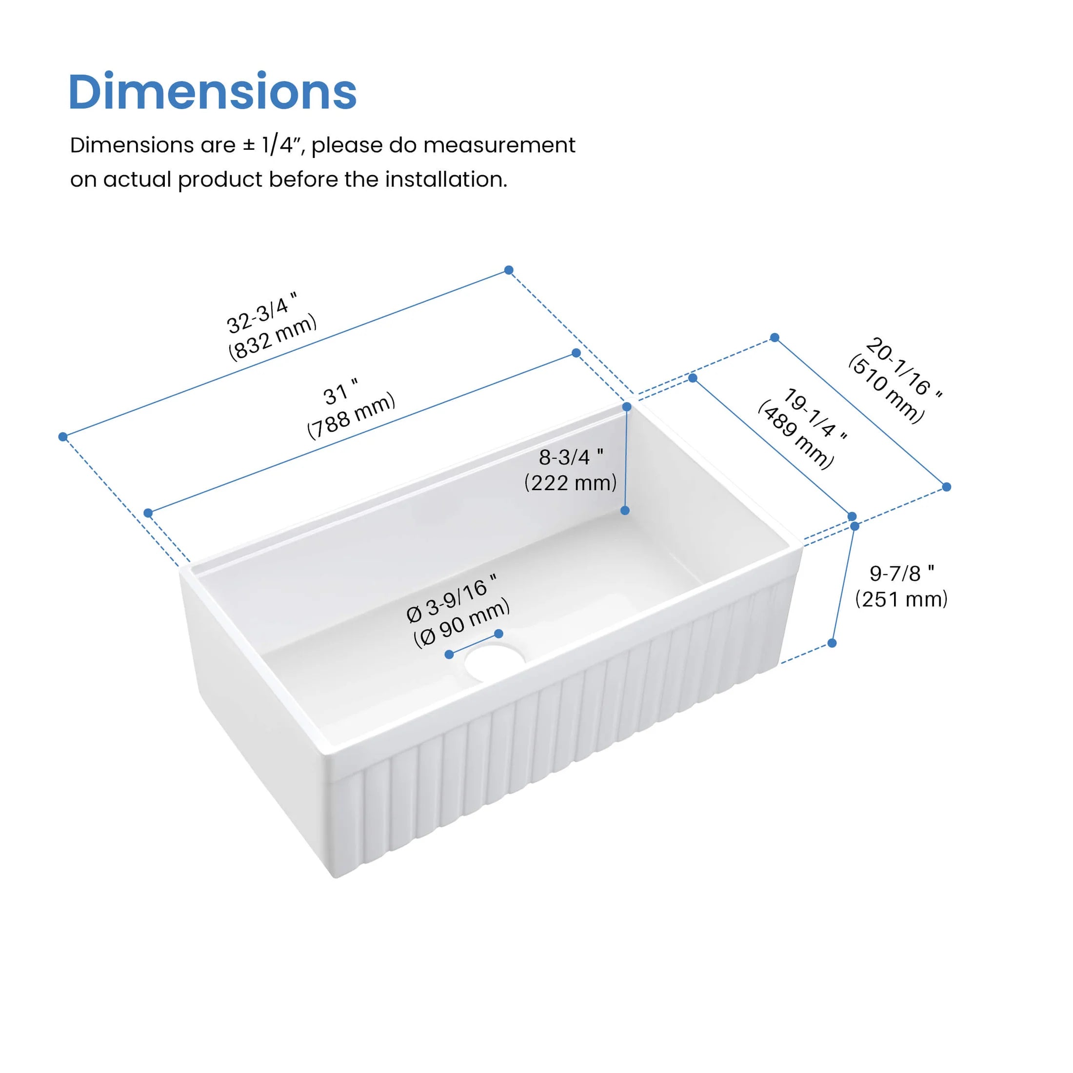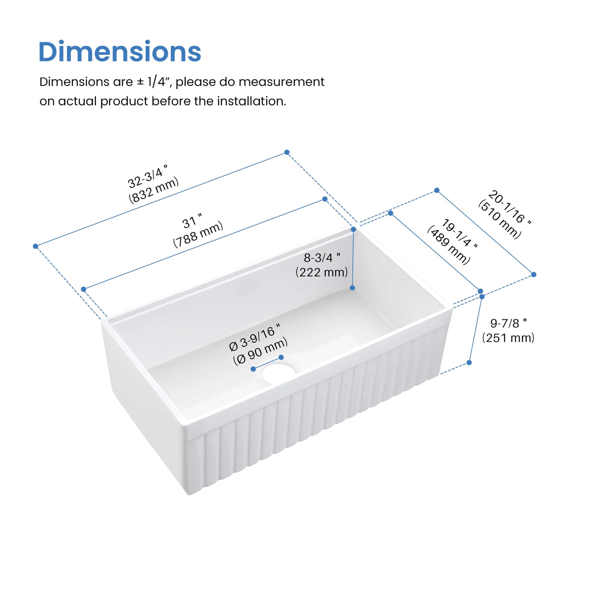 - Dimension Variations: Due to the firing process and the handcrafted nature of fireclay sinks, there may be slight variations in dimensions. It's important to note that dimensions can vary up to 3/8", so it's recommended to measure the countertop cut-outs after the sink is secured on the sink cabinet for precise installation.