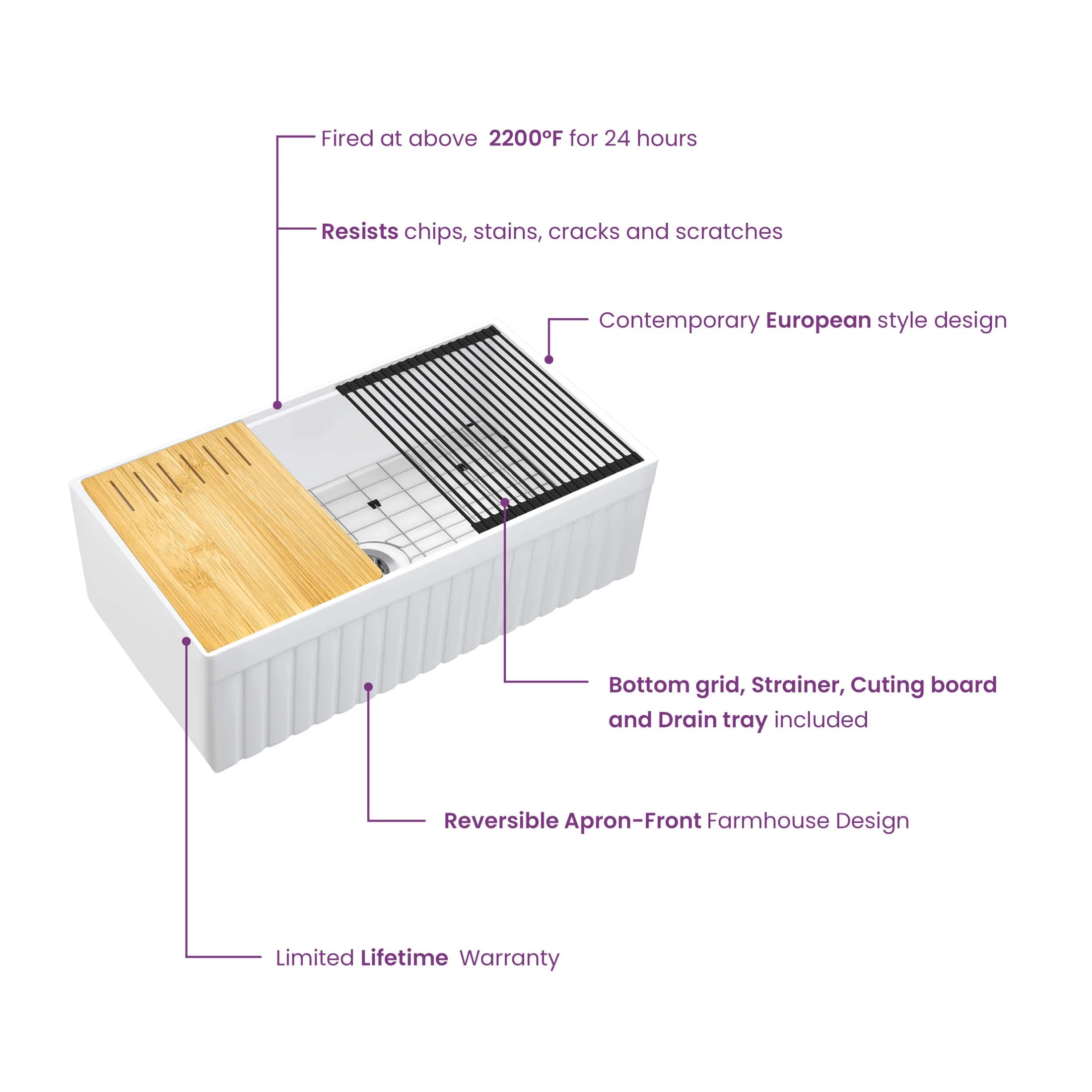 Package will include: Fireclay Sink, Bamboo Cutting Board, Stainless Steel Roll Up Tray, Stainless Steel Bottom Grid, Stainless Steel Strainer with Removeable Cover, Installation Guide.