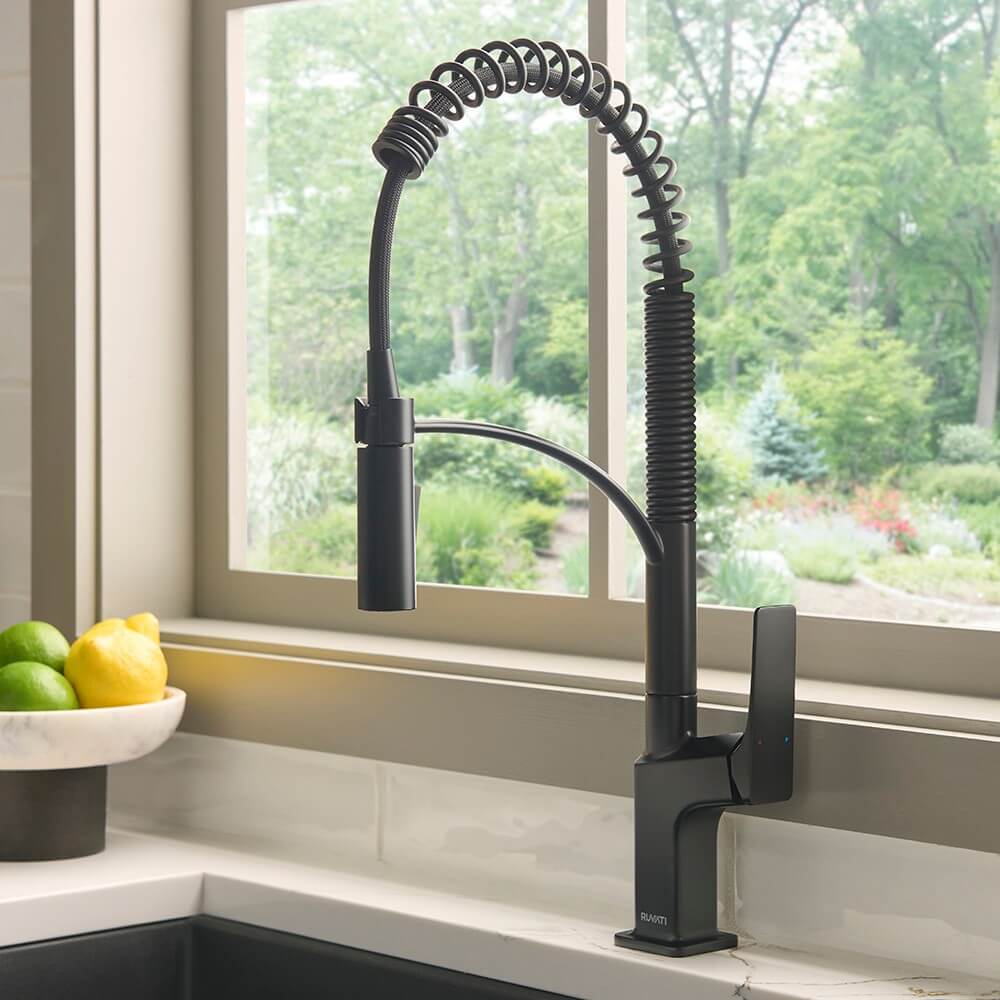 The Seneca Collection of kitchen faucets by Ruvati seamlessly blends contemporary design with innovative functionality. Each faucet features a 20 inch pull-down sprayer for optimal reach and versatility, while the spring-assisted design delivers both industrial style and practicality. Available in brushed nickel, brushed gold, and matte black, these elegant finishes are designed to harmonize with Ruvati sinks and other premium kitchen fixtures. Enhance your kitchen’s aesthetic and functionality with the Seneca Collection, where style meets performance for the modern home.