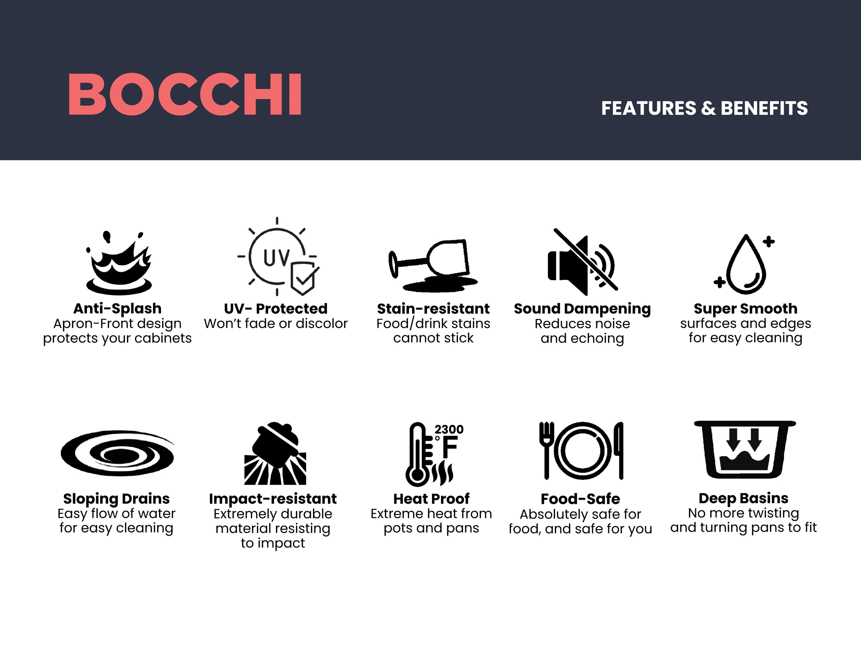 Through a specialized firing process in kilns reaching 2000°F, BOCCHI fireclay becomes the most durable material in the modern kitchen. This extreme high-heat manufacturing ensures your sink is thermal shock resistant, easily handling boiling pots and heavy pans without the risk of cracking or damage.