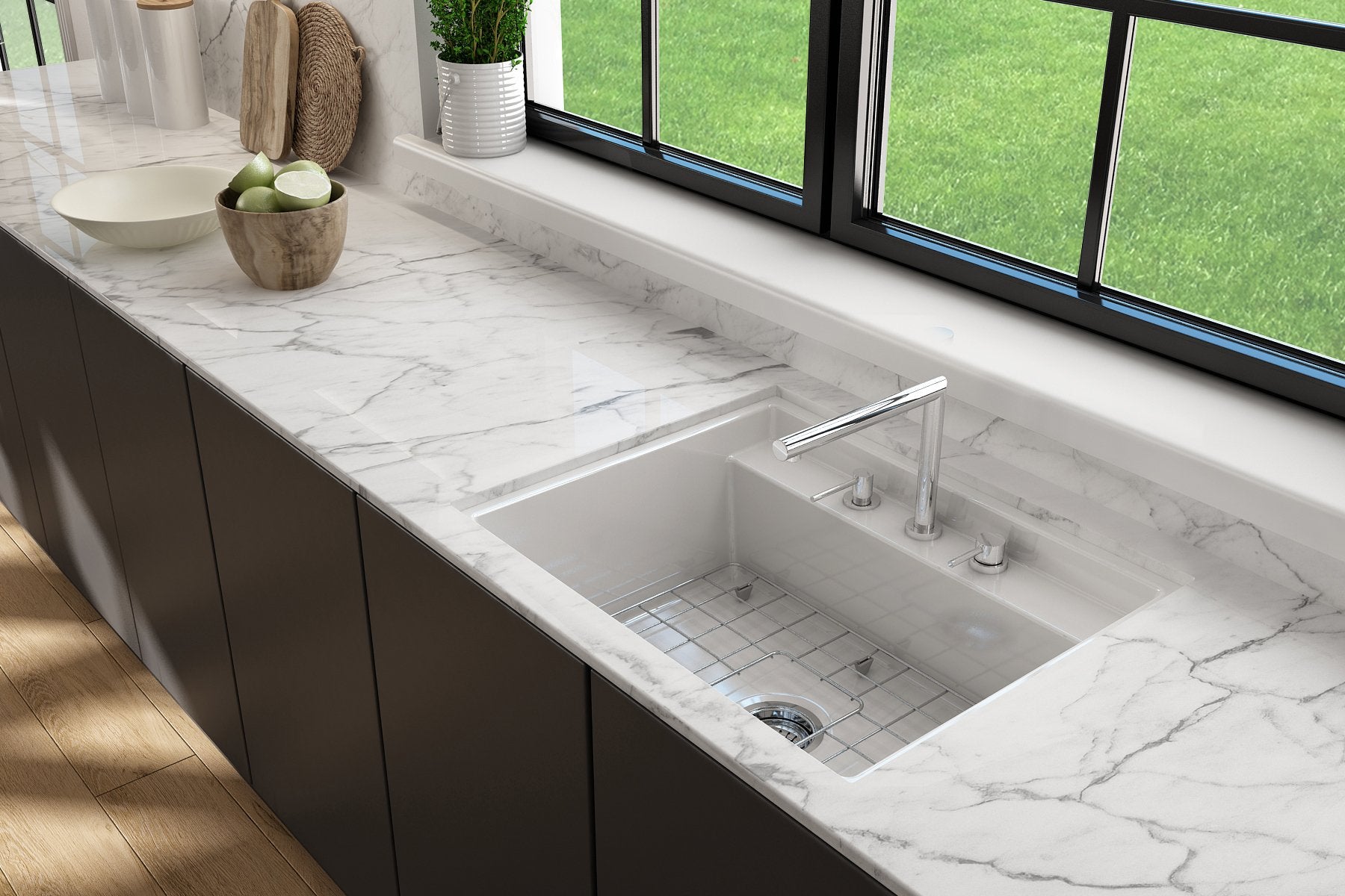 - Integrated Workstation ledge for use with customized accessories: cutting boards, colanders and roller mats; with unique hide-away features