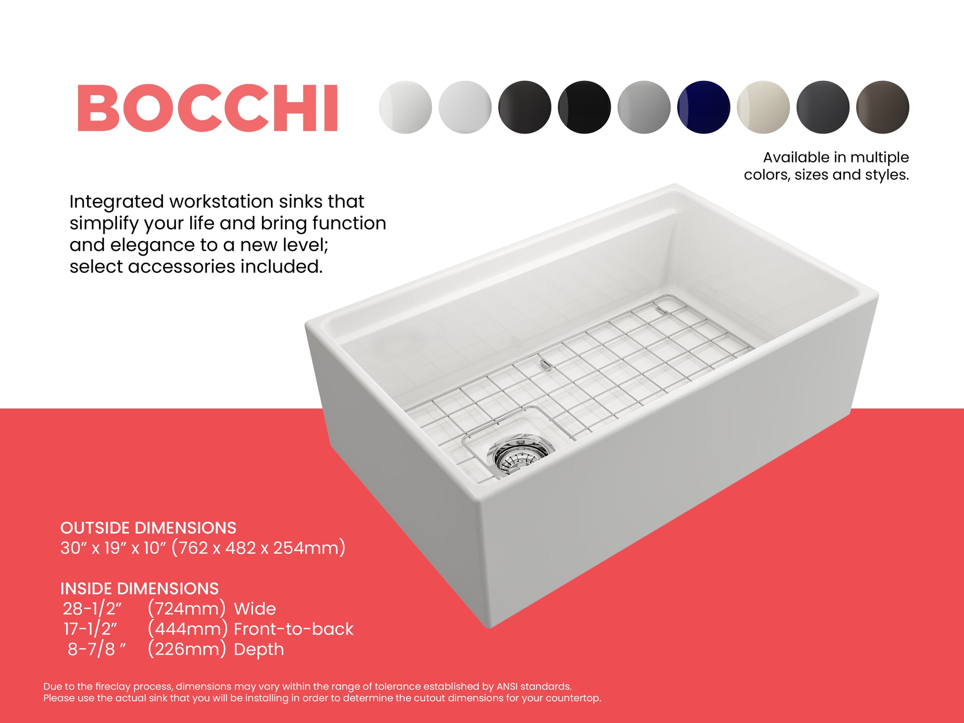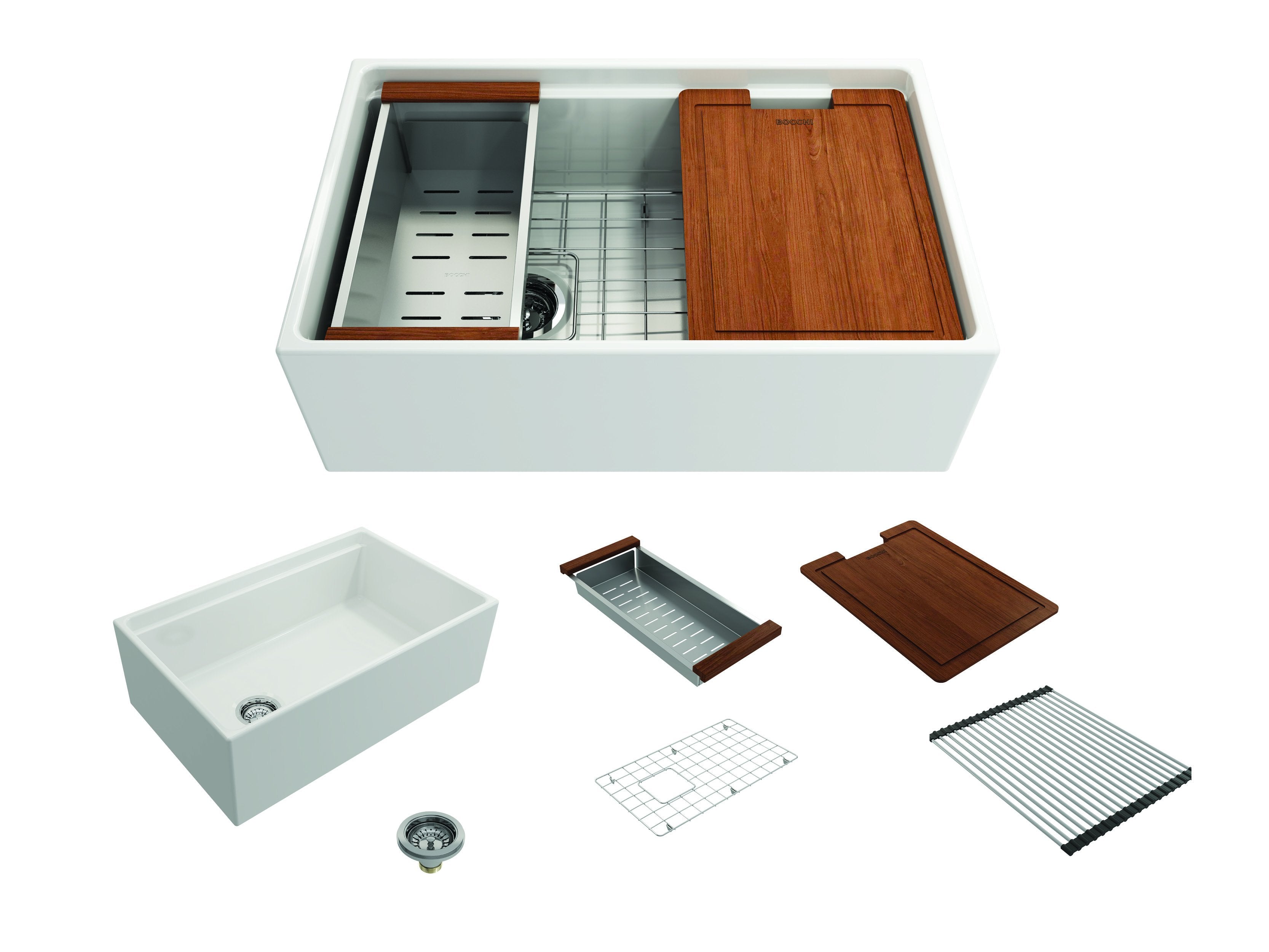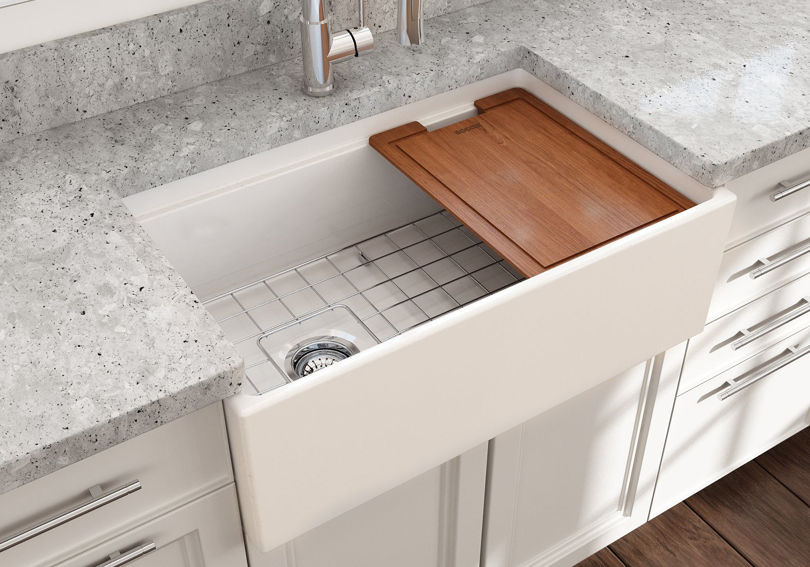 Fired in kilns at temperatures up to 2000°F, fireclay becomes exceptionally strong, making it ideal for handling extreme heat from pots and pans. The specialized glaze, permanently fused to the fireclay body, creates a smooth, non-porous surface that resists scratches, stains, discoloration, and everyday wear. Finished with a protective bottom grid and a signature apron-front design, BOCCHI Farmhouse Sinks are thoughtfully engineered to deliver both beauty and performance.