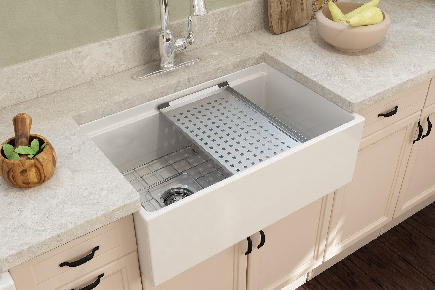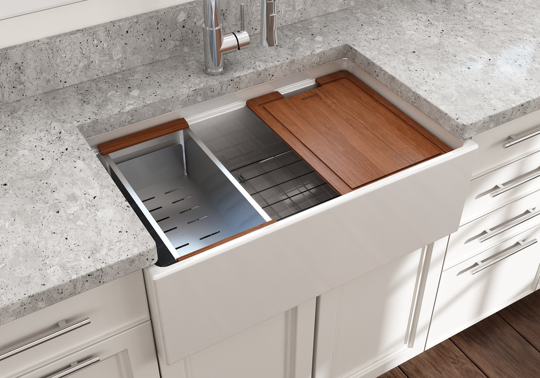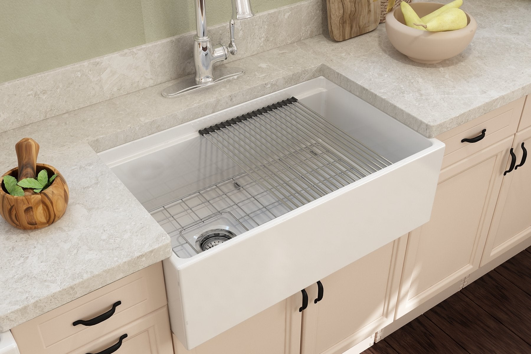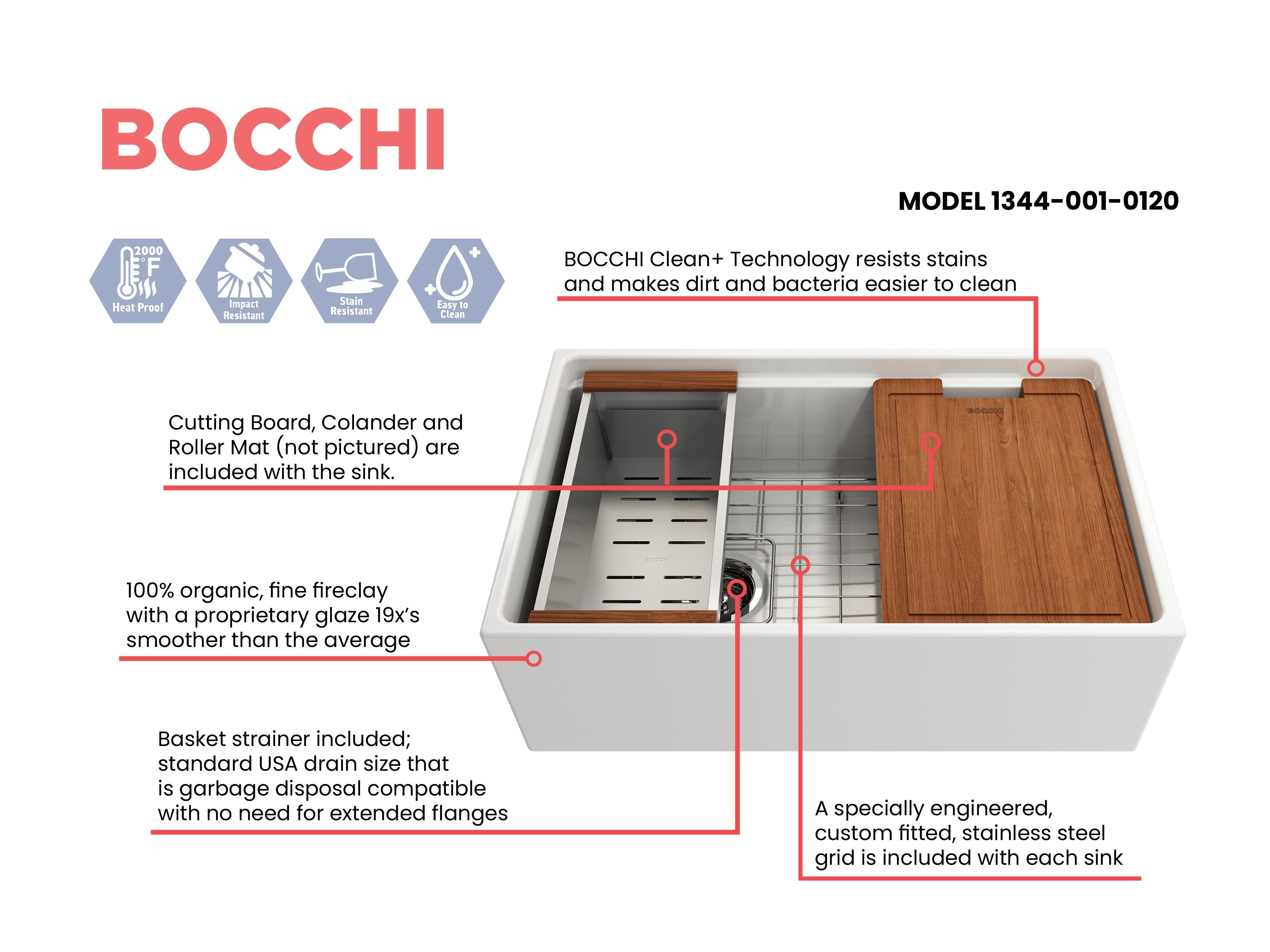Fired in kilns at temperatures up to 2000°F, fireclay becomes exceptionally strong, making it ideal for handling extreme heat from pots and pans. The specialized glaze, permanently fused to the fireclay body, creates a smooth, non-porous surface that resists scratches, stains, discoloration, and everyday wear. Finished with a protective bottom grid and a signature apron-front design, BOCCHI Farmhouse Sinks are thoughtfully engineered to deliver both beauty and performance.