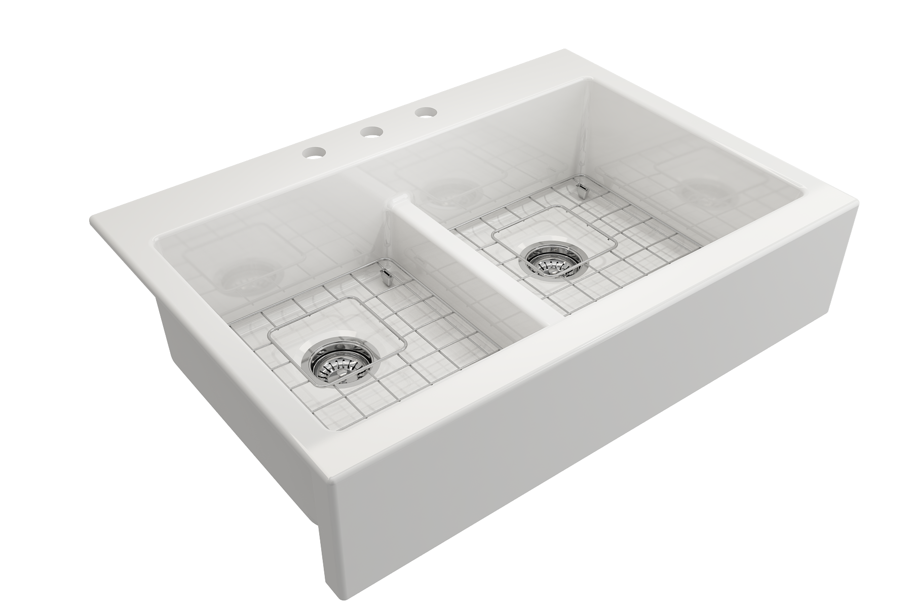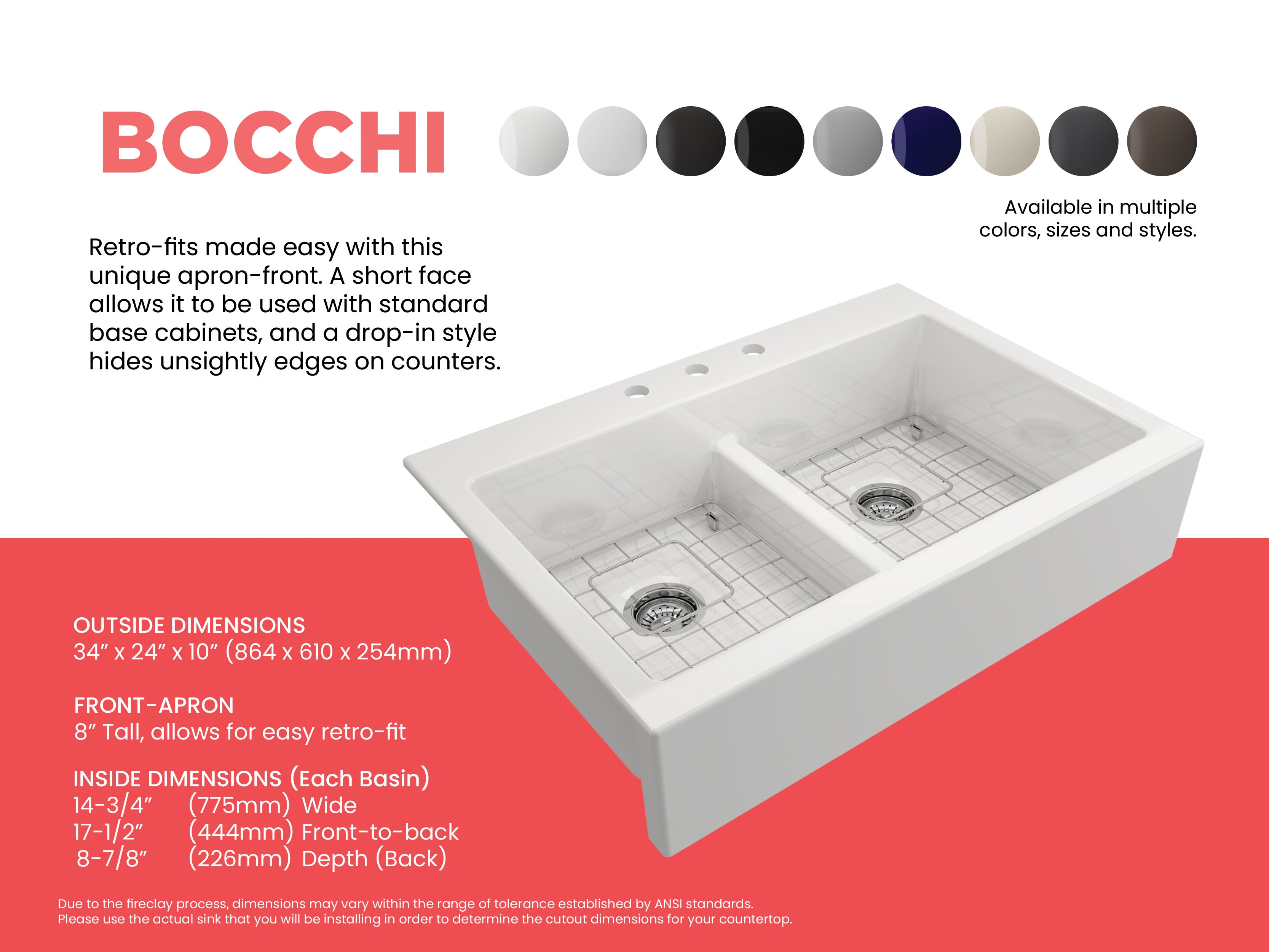 Thanks to a specialized glaze fused directly to the fireclay body, these sinks feature a non-porous, uniform surface that resists scratches, stains, and everyday wear. Complete with a protective bottom grid and a distinctive apron-front design, BOCCHI Farmhouse Sinks are thoughtfully crafted to meet both your aesthetic vision and functional needs.