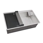 - INCLUDED IN BOX: Sink, stainless steel colander, solid wood cutting board, dish drying foldable rack, stainless steel bottom rinse grid, basket strainer drain assembly, decorative drain cover, cut-out template, and mounting brackets.