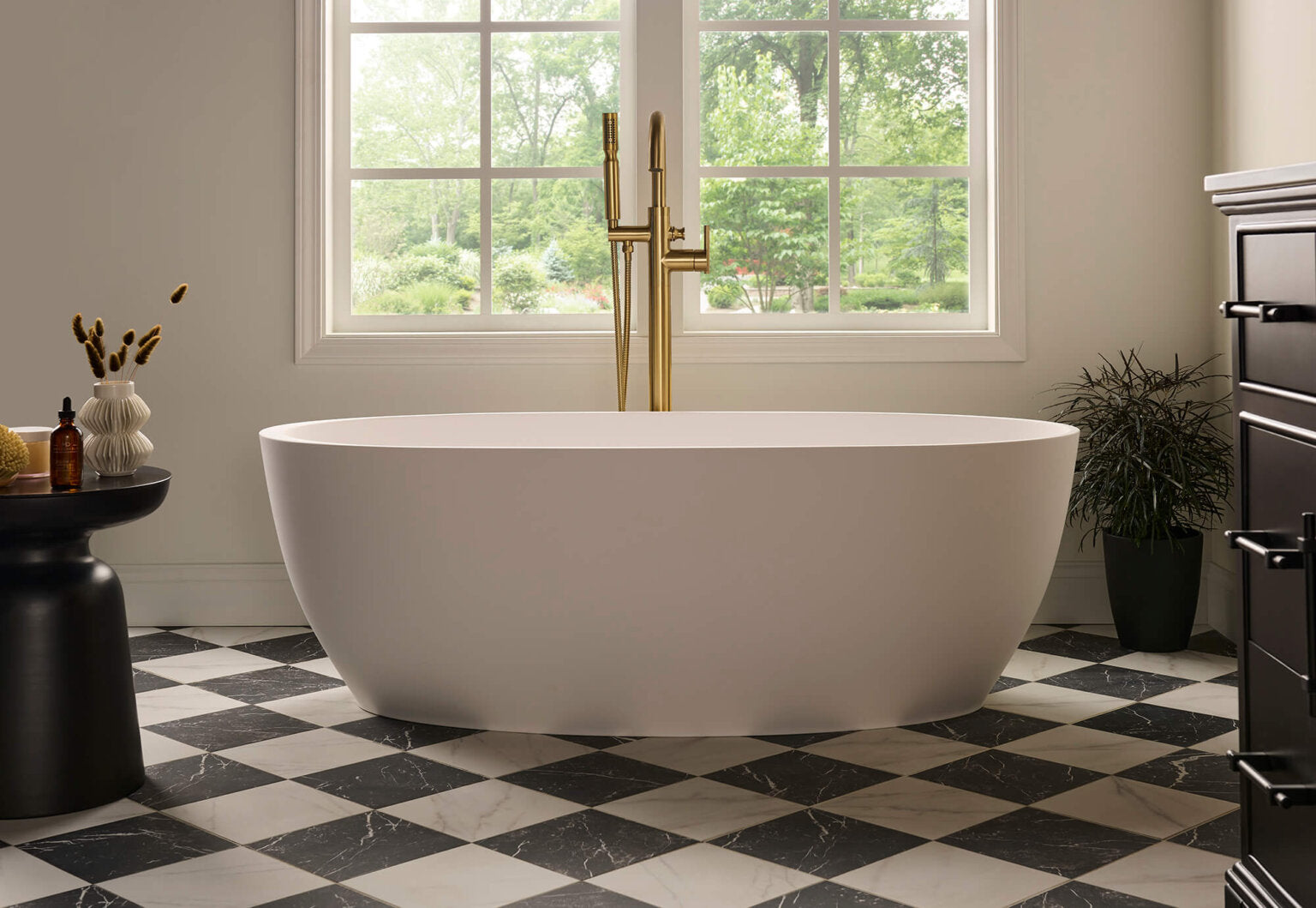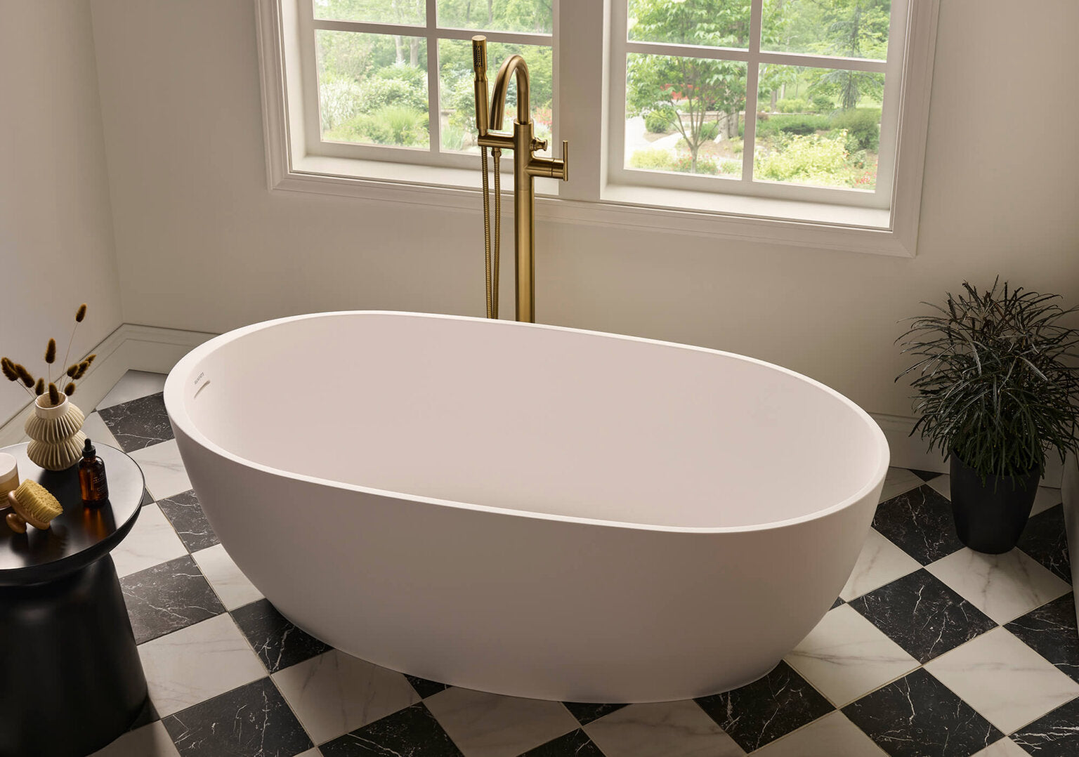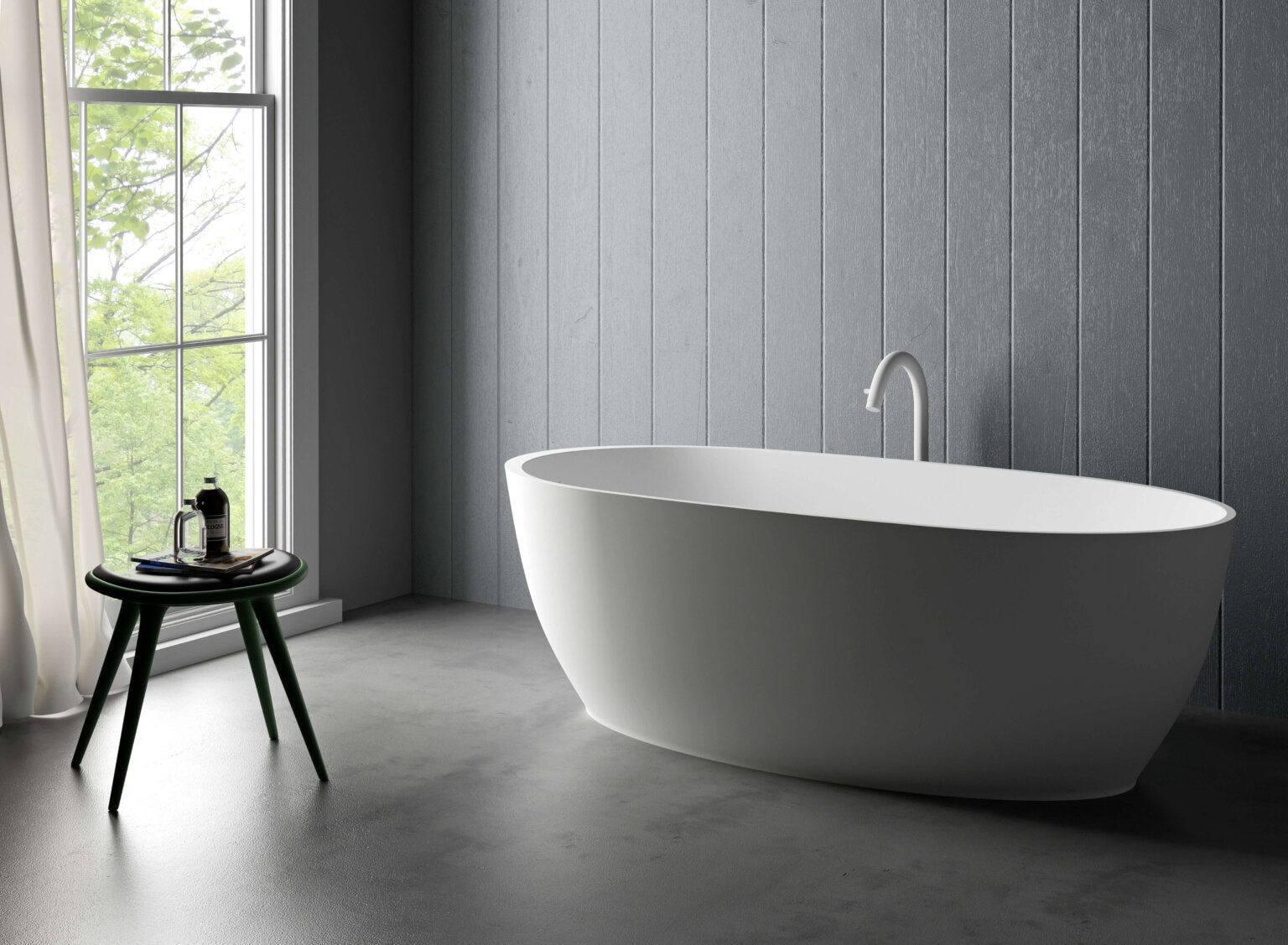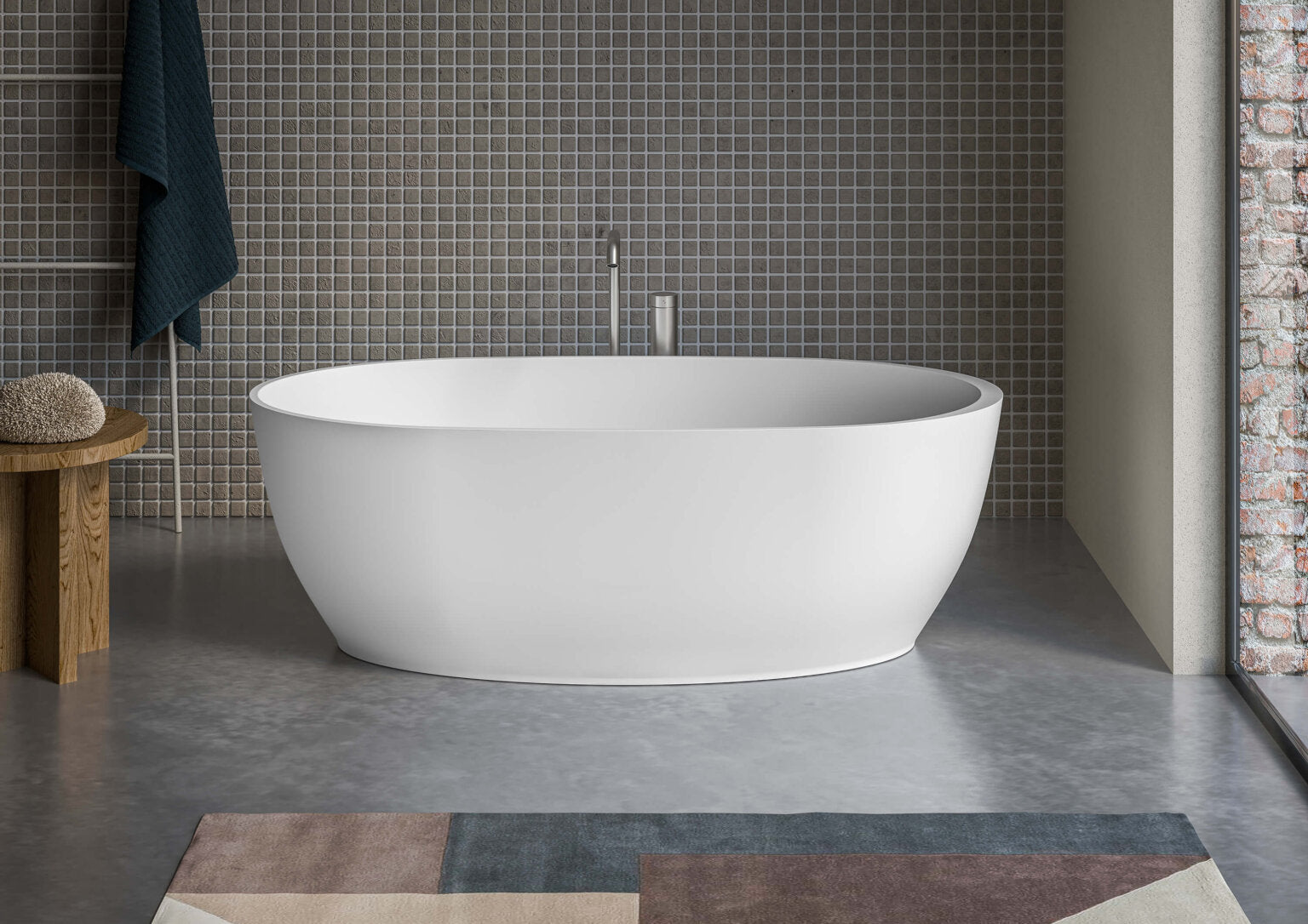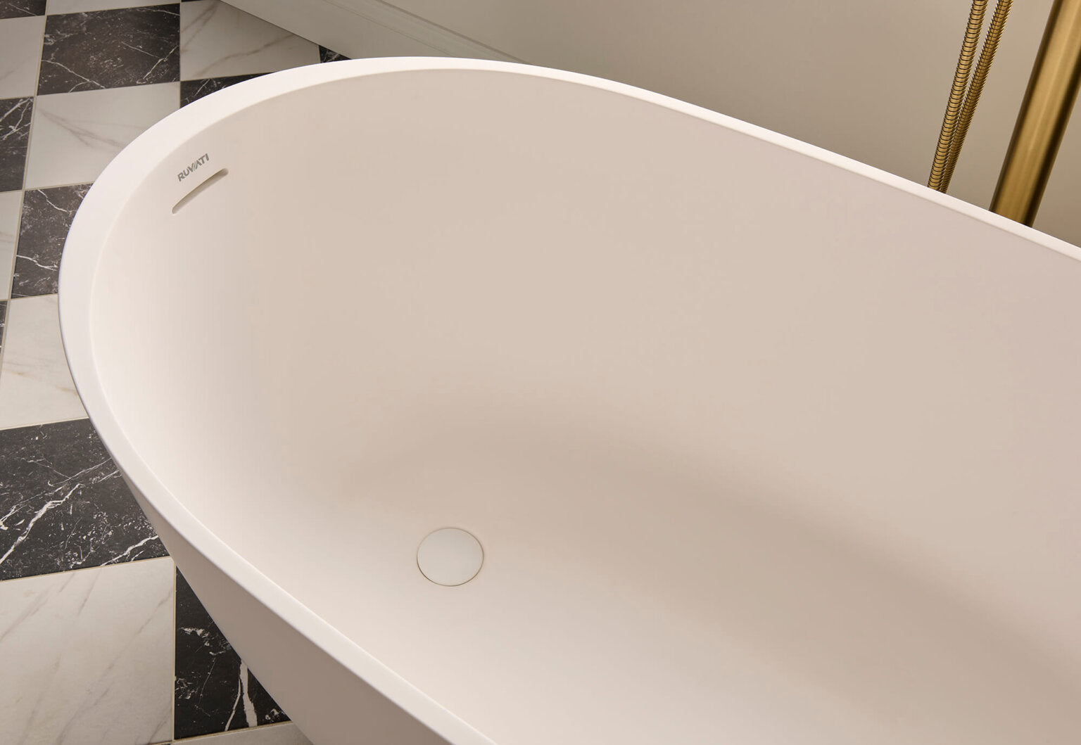 Introducing Ruvati’s latest innovation: Italian-made epiStone freestanding bathtubs are the perfect addition to your modern bathroom. EpiStone is an engineered stone that we developed using state-of-the-art technology to bring exceptional strength and beauty to our bathroom collection. It is composed of 70% crushed natural stone and minerals bonded with a proprietary resin that gives the material its strength and durability. Naturally beautiful with a look similar to real stone, the epiStone material is strong, durable, and has a luxurious satin finish that is silky to the touch. Made in Italy, the Canali collection of freestanding bathtubs are a luxurious statement piece accompanied by easy installation and creative placement options. The double-ended oval shape provides maximum comfort and allows for easy cleaning. Available in white or black, the Canali collection is the most modern option for your bathroom renovation.